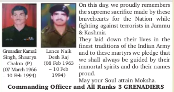 These two 'Grinders' of the Third Battalion fell fighting Pakistan sponsored terror in Kashmir this day 29 years ago.