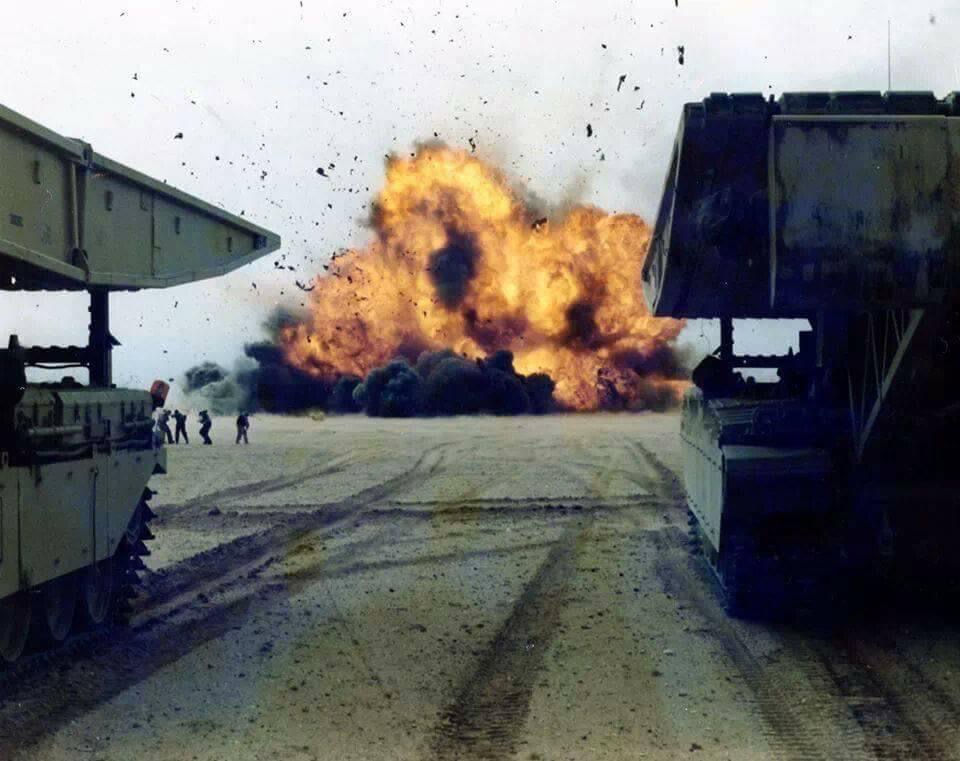20) The detonation naturally set the AVRE behind on fire and was not strictly a sympathetic detonation because it blew up about 30 seconds after the first. The AVLB was being used to try and tow the second AVRE away but that was abandoned when we realised it was too late.
