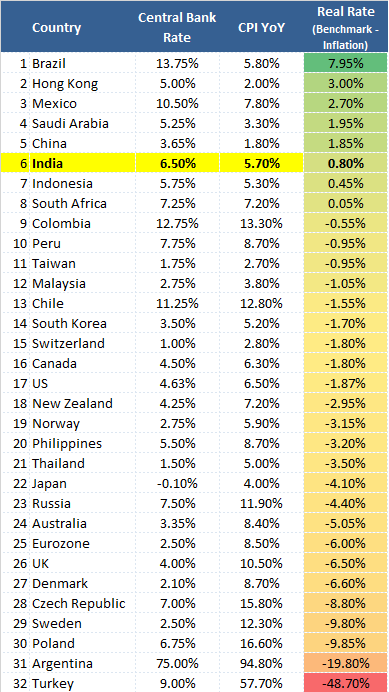 India now has the 2nd highest real policy rate for countries where infaltion is within the Central Bank's traget range. (See image)
