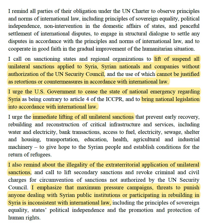 Here is the top UN expert on sanctions, Special Rapporteur @AlenaDouhan, explaining how illegal US/EU sanctions on Syria have made it extremely difficult to provide humanitarian aid.