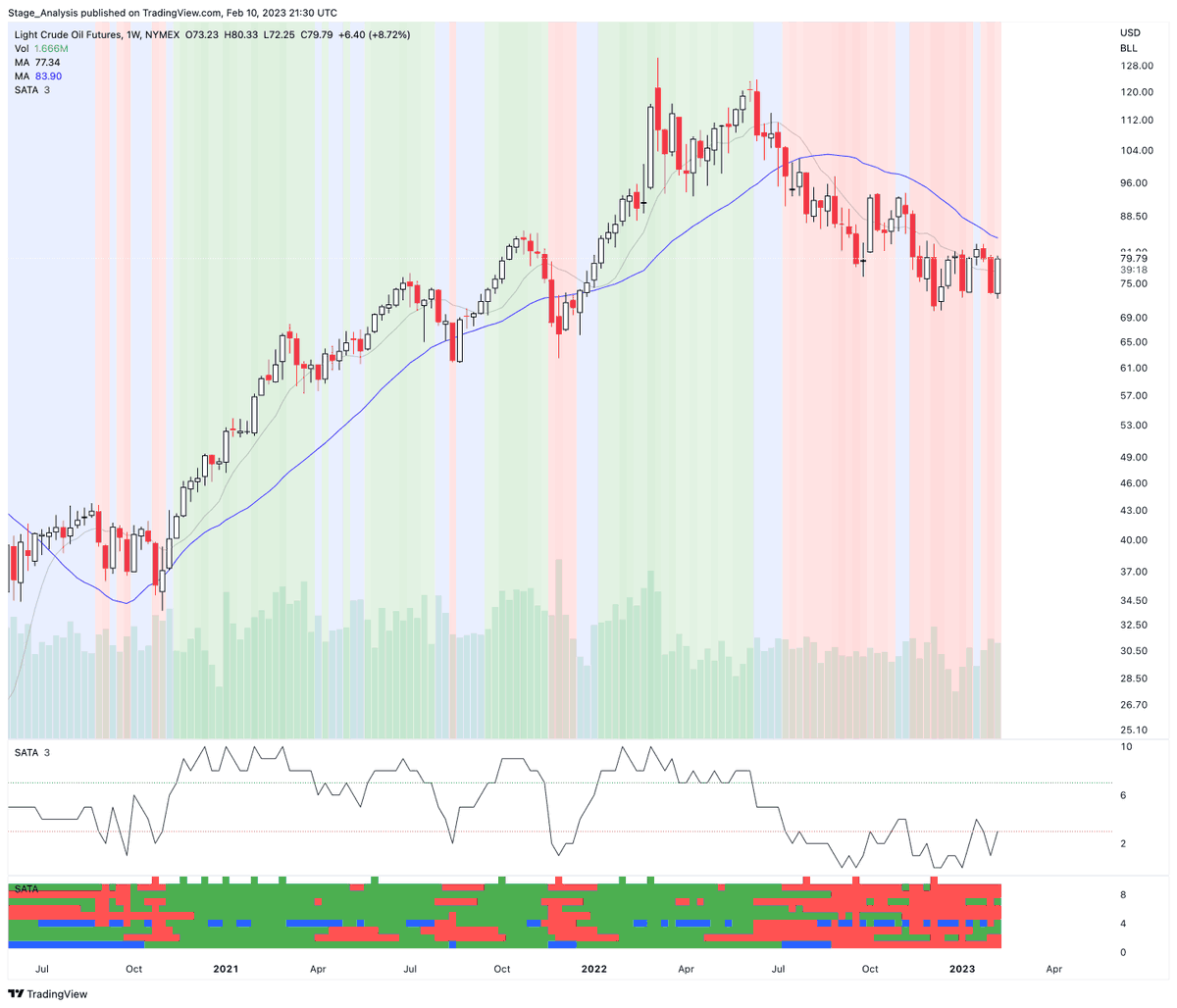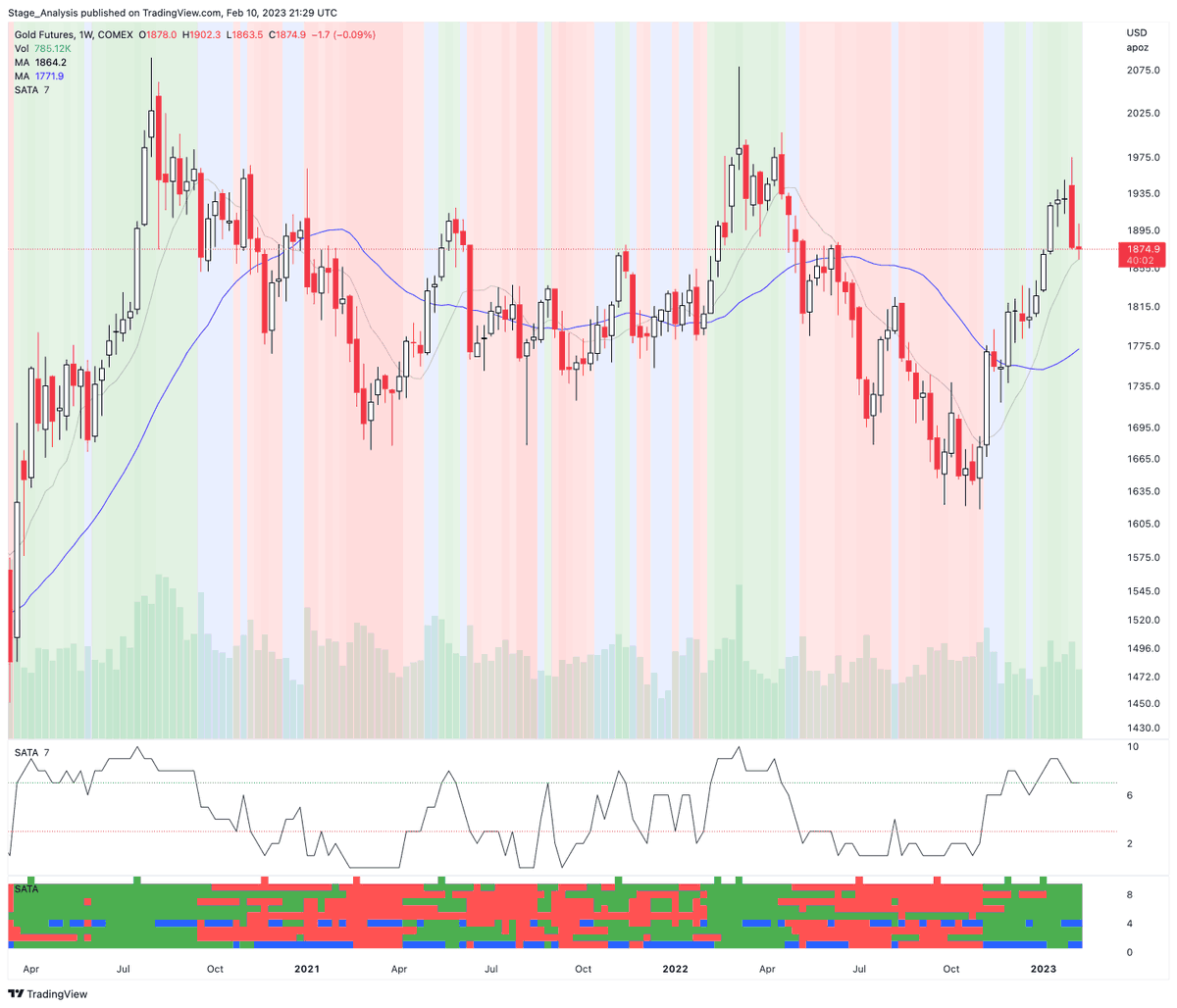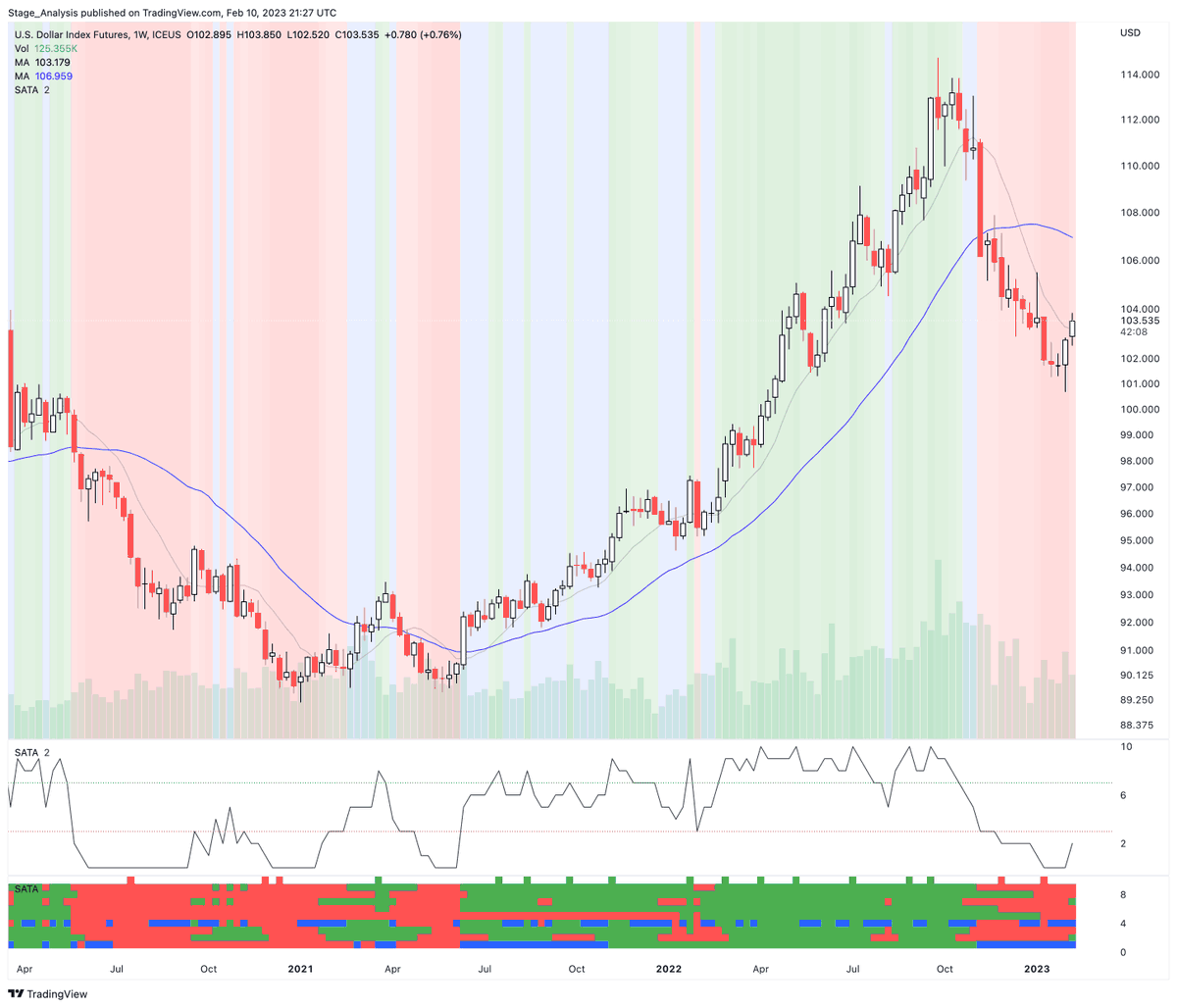Dollar Index – Stage Analysis Technical Attributes (SATA) chart with multiple variations of the indicator.