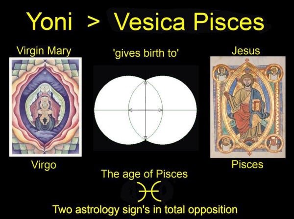 Vesica Piscis is, also, a Symbol of the Sacred Feminine (Vulva/ Yoni) Aspect. It represents the Womb, which is Portal into the Material Realm. The Vesica Piscis represents the intersection of G-d & Man, Heaven & Earth.