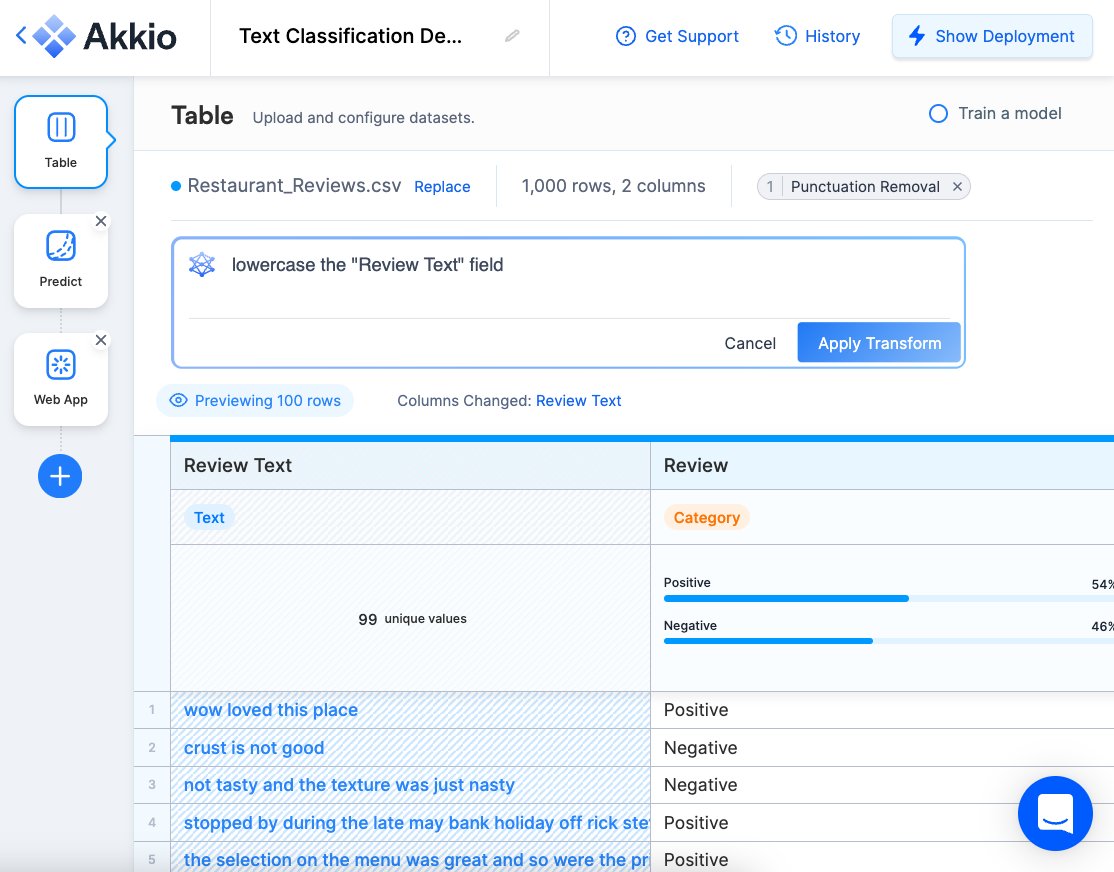 Let’s say we want to train a sentiment classifier on a restaurant reviews dataset. Here are two transformations you can perform on the text data: