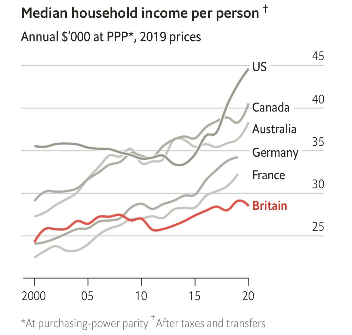 In other words, I don't see any obvious way to reconcile the UK's low median income numbers with its robust per capita GDP numbers. So what's going on?