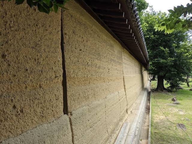 Individual sections has collapsed during quakes but are quickly repaired reusing the same material. Ingredients are 80% decomposed granite soil, 10% clay and 10% lime. The main enemy is poor drainage.