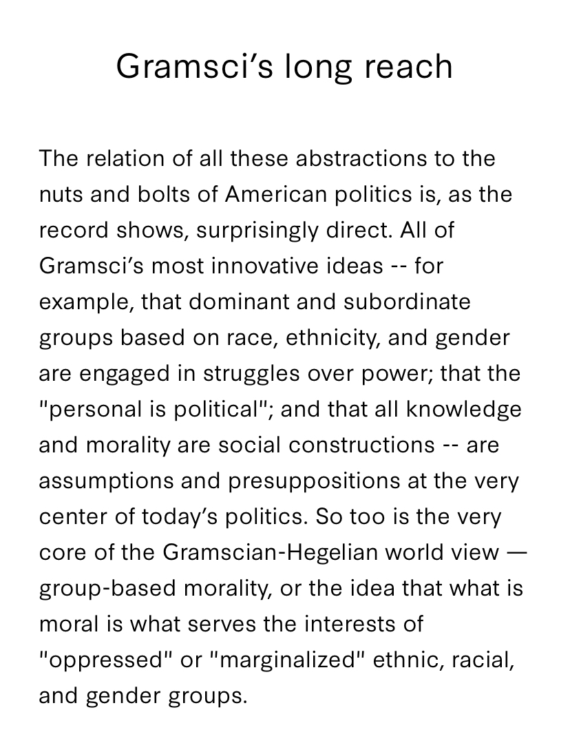 As the influence of his thought spread, Gramsci's acolytes embarked on that endeavor. The campus radicals of the 1960s now occupy tenured professorships at top universities, prestigious positions in corporate boardrooms and elite media, and so on. As @FonteJohn wrote in 2000: