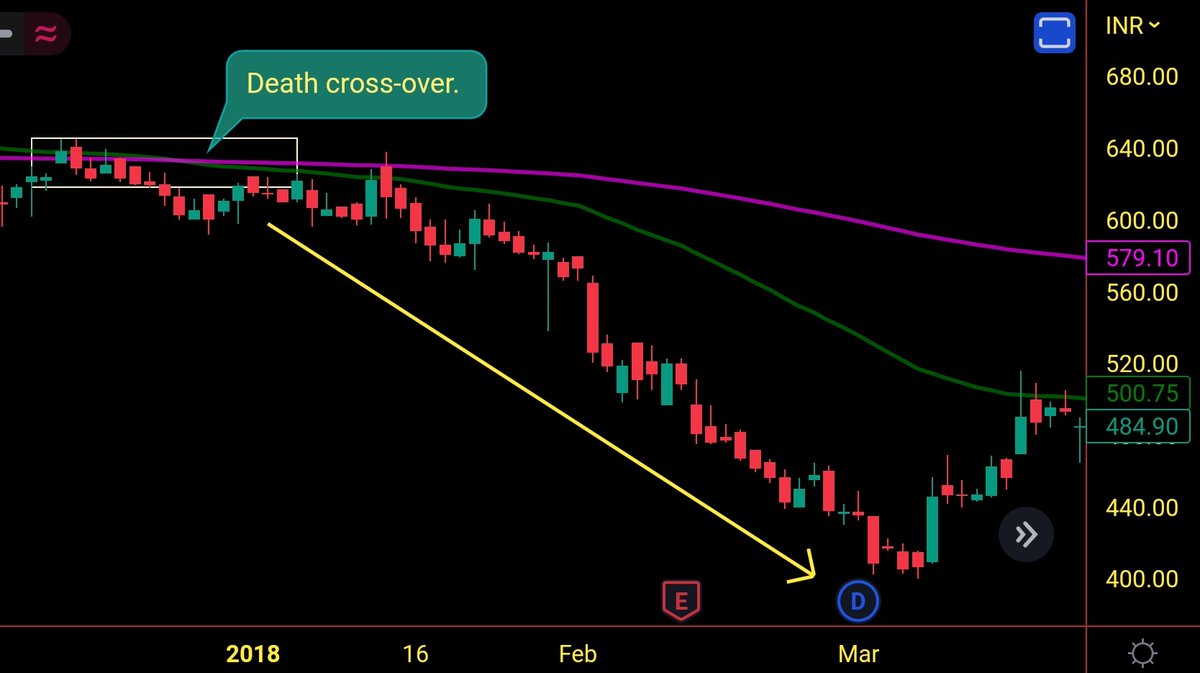 Generally, when 50 EMA crosses 200 EMA from above we can say it as a death cross-over.