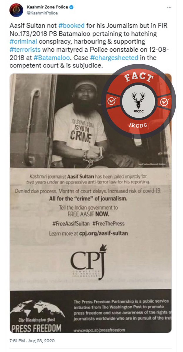 aiding and participating in terrorism related activities. A charge-sheet against Asif Sultan was filed by J&K Police for sheltering terrorist who killed a Police constable in a shootout in August 2018 at Batamaloo in Srinagar