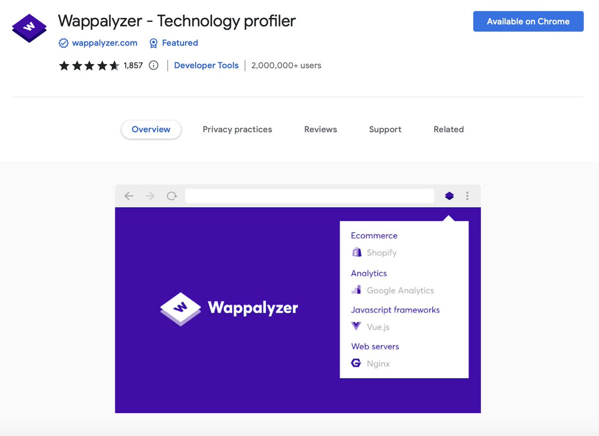 Well, with this extension, you'll be able to uncover what CMS or framework, programming languages, payment processors, CRM, CDN are being used by an app.