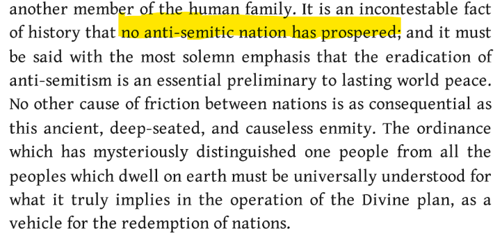 "Parochialism" is the "most limiting factor in the realization of peace" (p 105). Christians & Christianity "need the universal international outlook of Judaism" (p. 106). We see too today how Globalism abhors this parochialism, which is foreign to the mercantilist Jewish spirit.
