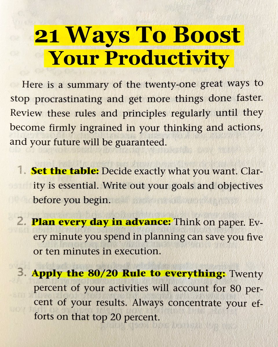 10) Take it one oil barrel at a time. 11) Upgrade your key skills 12) Identify your key constraints 13) Put the pressure on yourself 14) Motivate yourself into action 15) Technology is a terrible master
