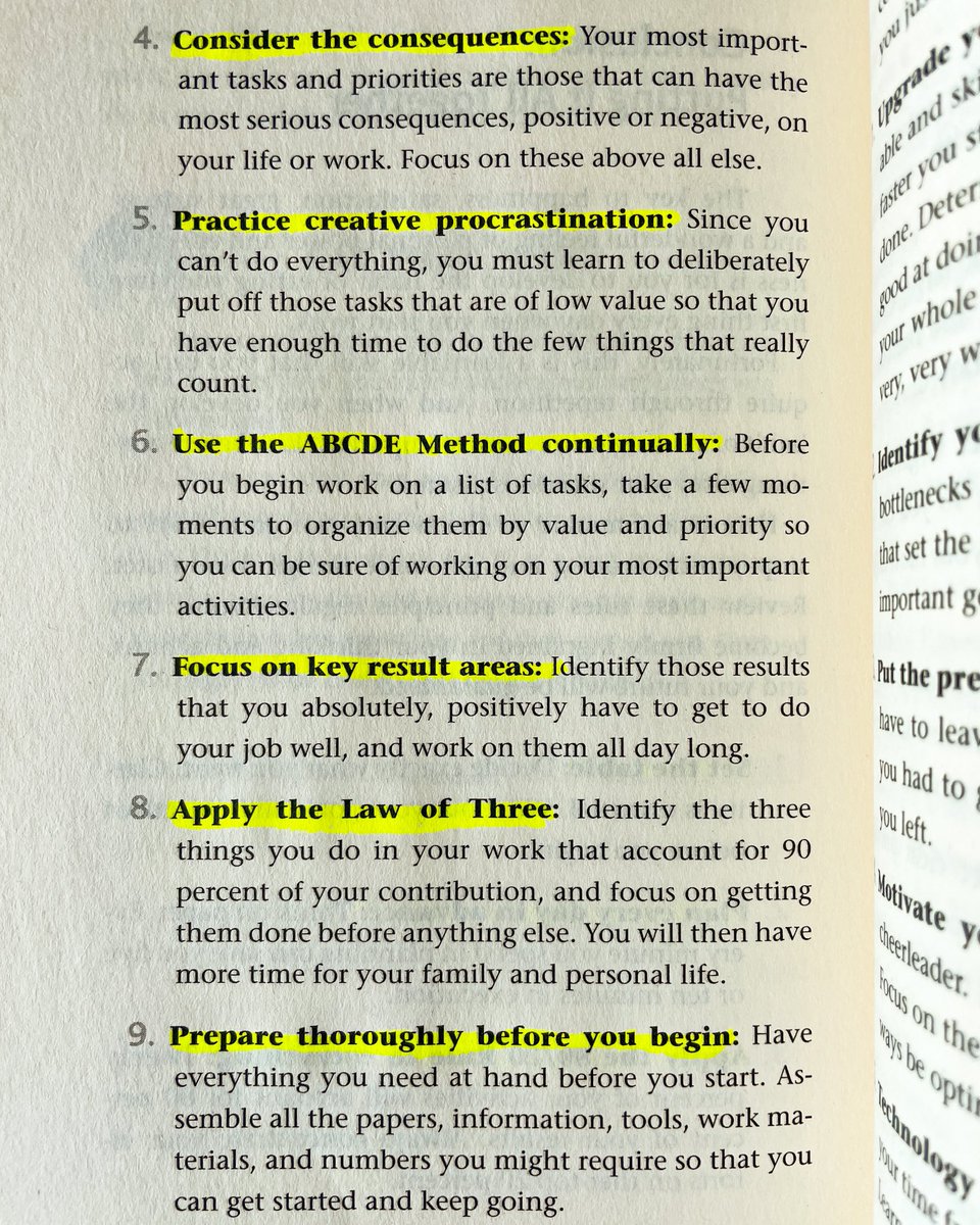 4) Consider the consequences 5) Practice creative procrastination 6) Use the ABCDE Method 7) Focus on key result areas: 8) Apply the Law of Three 9) Prepare thoroughly before you begin