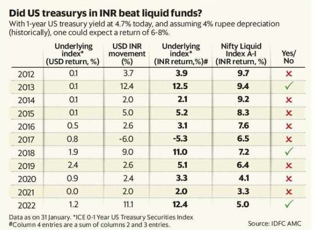 Let's be clear, Indian liquid funds have beaten US treasuries almost every year for the past 10 years even adjusting for rupee depreciation. But things have changed now, and dramatically with rising yields.