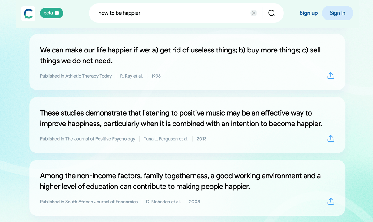 We can just type in a topic / question we’re researching (e.g. how to be happier), and it will search through this huge database of scientific papers to find all the relevant information we need.