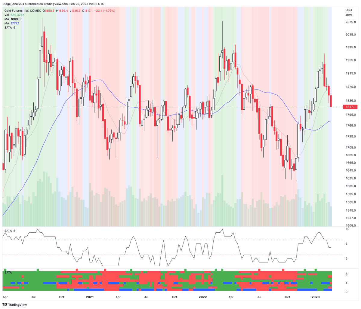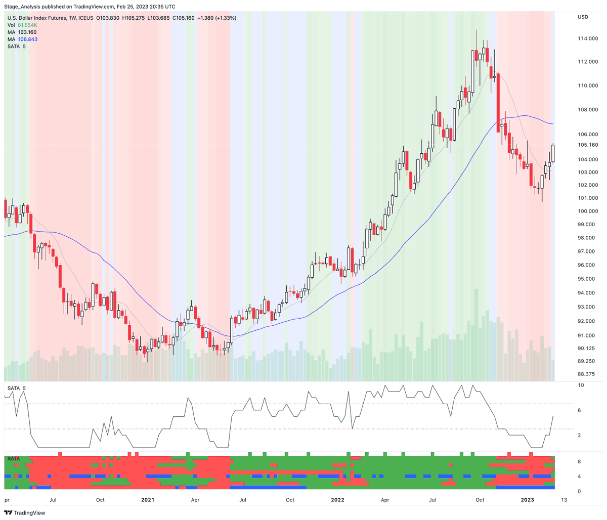 Dollar Index – Stage Analysis Technical Attributes (SATA) chart with multiple variations of the indicator.