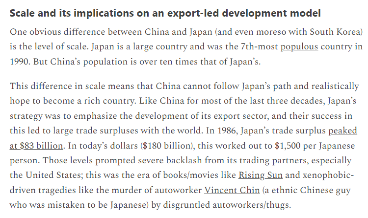 ... namely that the export-led development model could not scale for an economy the size of China's due to the inevitable stress on trade relations that we have been witnessing since the GFC