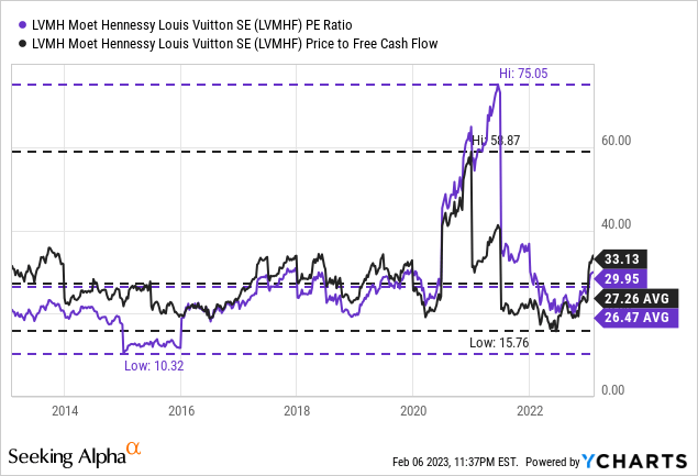 Even though valuations are down, $LVMH is trading at one of the highest valuation multiples in 10 years.