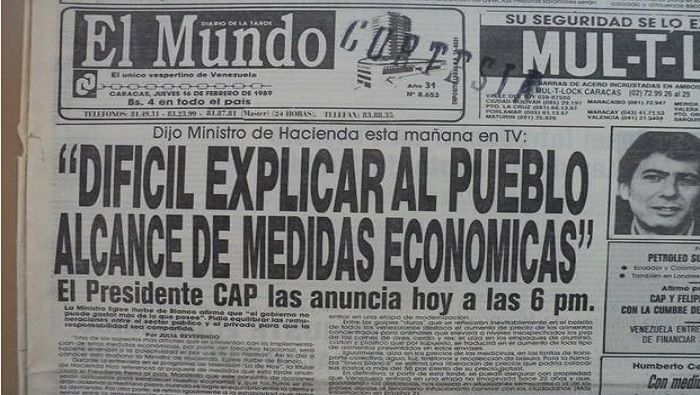 A década de 1980 foi marcada na Venezuela por uma grave crise econômica. A queda abrupta do preço do barril do petróleo nos mercados internacionais havia causado um enorme desequilíbrio fiscal na economia venezuelana, muito dependente da exportação dessa commodity. 2/17