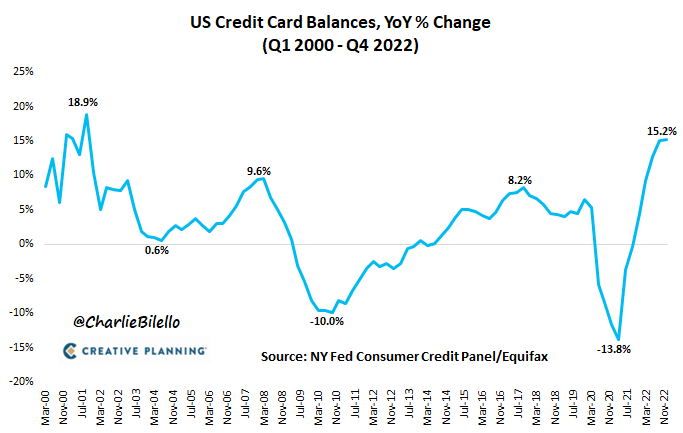 Credit card balances in the US increased 15.2% over the last year, the biggest YoY jump since the 2001 recession.