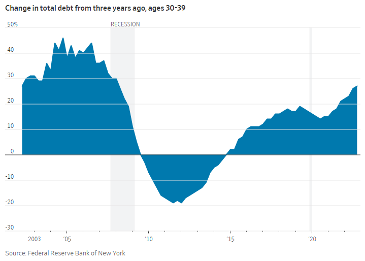 Total debt balances for Millennials hit more than $3.8 trillion in the fourth quarter of 2022, a 27% increase from late 2019. That’s largest increase for any age group.