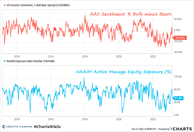 It only took a 5% S&P 500 pullback to push the AAII poll back into bearish territory, with bears once again outnumbering bulls. At the same time, active managers have quickly reduced their exposures (from 85% down to 57%).