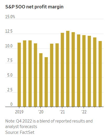 S&P 500 net profit margins were down for the 6th consecutive quarter (to 11.3% from a peak of 13% in 2021). While sales are still rising, higher input costs (labor/materials/energy) are hurting the bottom line.