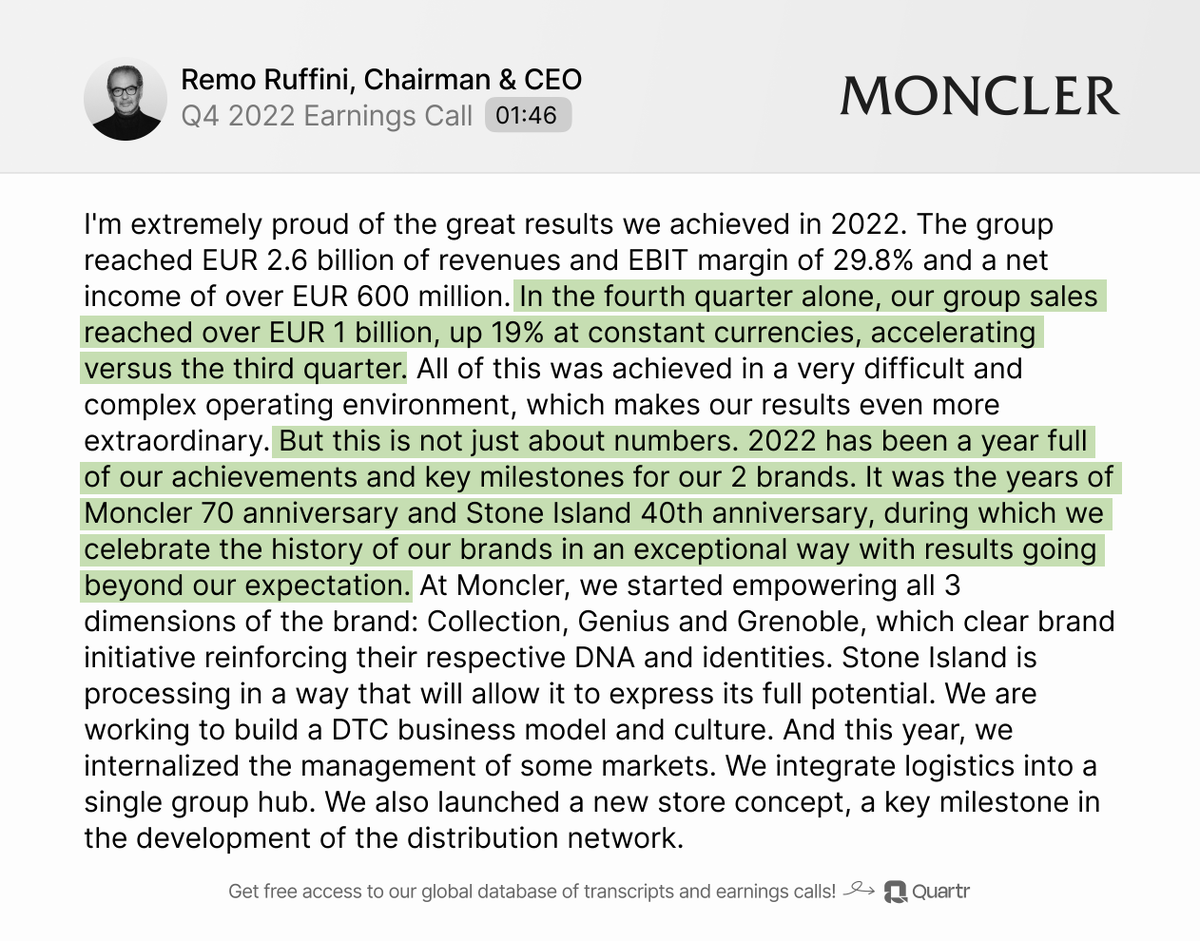 🇮🇹 $MONC, owner of @Moncler and @stoneisland, reported a stronger than expected Q4 yesterday – showcasing the strength of luxury during tough times!