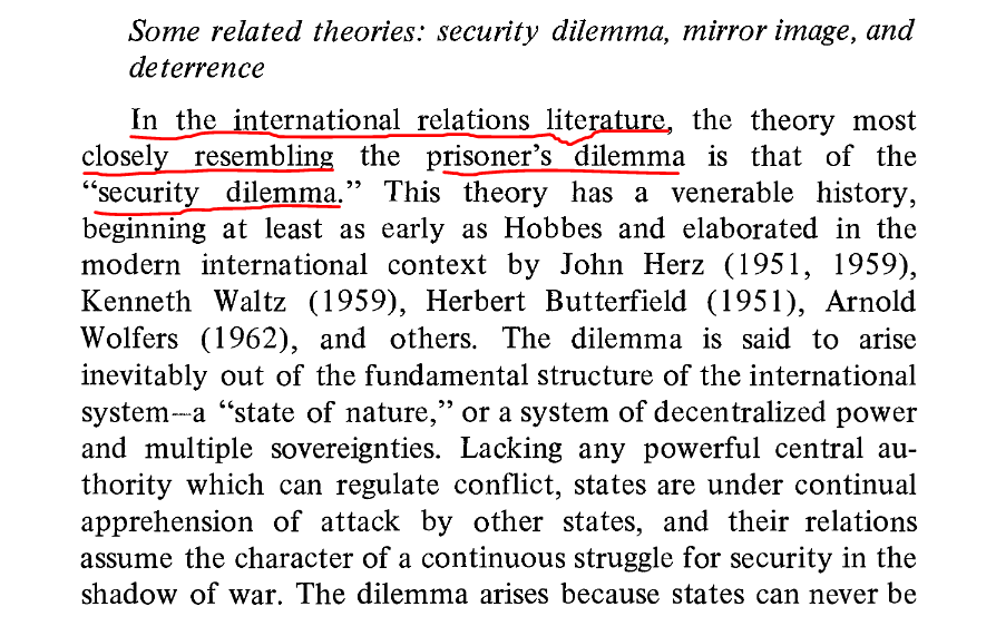 Snyder's paper cites some work by Bob Jervis. That's important, because Jervis' later paper, his 1978 @World_Pol article, became a "go to" cite for using the prisoner's dilemma to depict the difficulties of international cooperation.