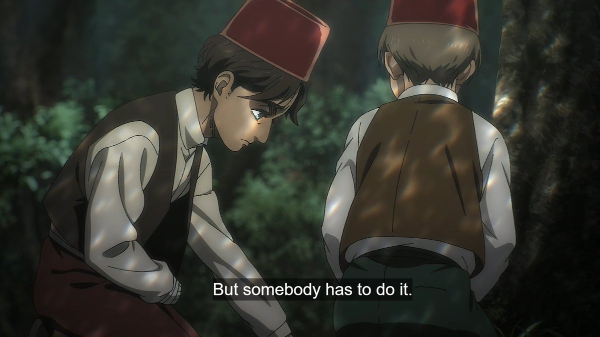 The mere fact they HAD to steal and how this connects to their brutal undeserving deaths tells us of the nature of our world and how AoT approaches poverty “The Rumbling” is the ultimate dehumanization but its also oddly a representation of the most common evil: The hell of war
