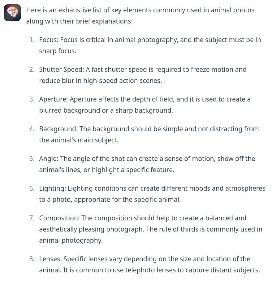 Generate an exhaustive list, comma-separated key elements used in animal photos, short explanations below the bulleted list, please include the most appropriate camera model. 哗啦啦AI写了一堆