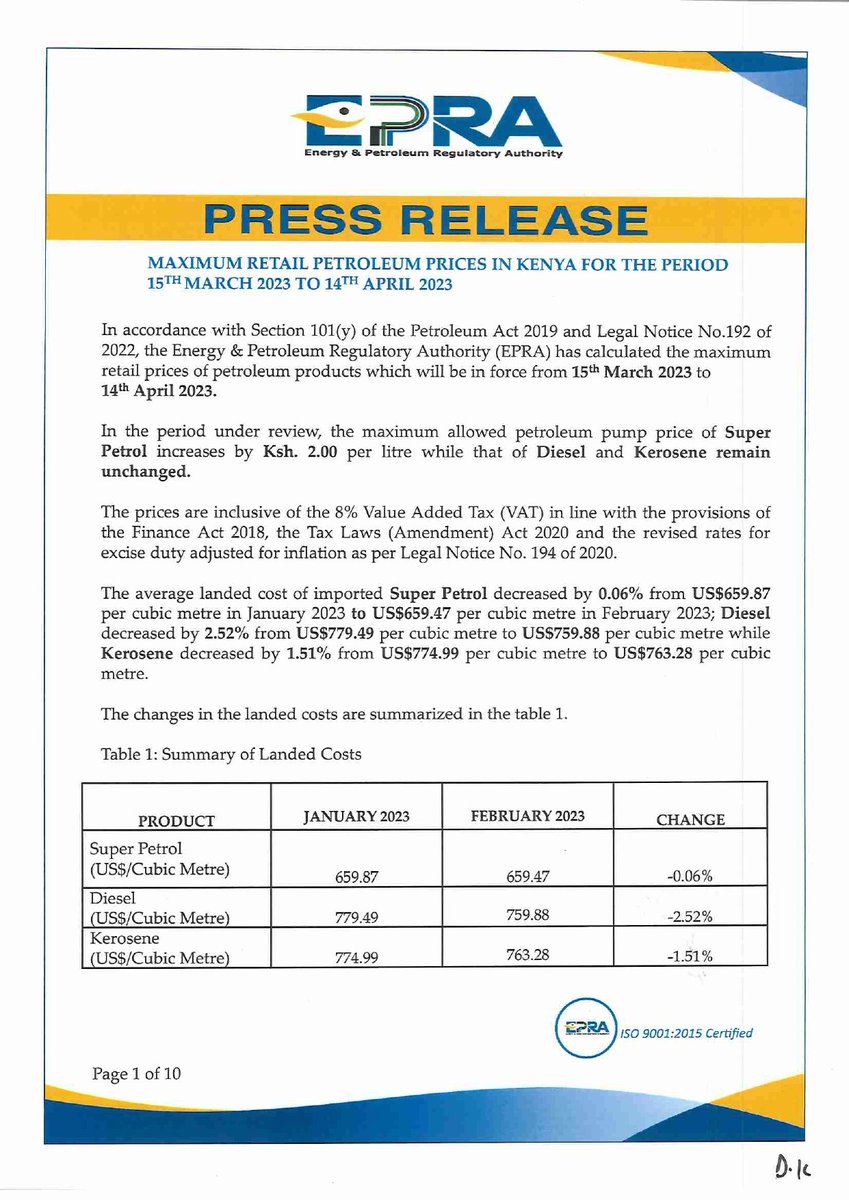 The Energy and Petroleum Regulatory Authority (Epra), which sets the prices, kept diesel and kerosene prices unchanged for the third month in a row at Sh162 a litre and Sh145.94 per litre, respectively, in Nairobi.