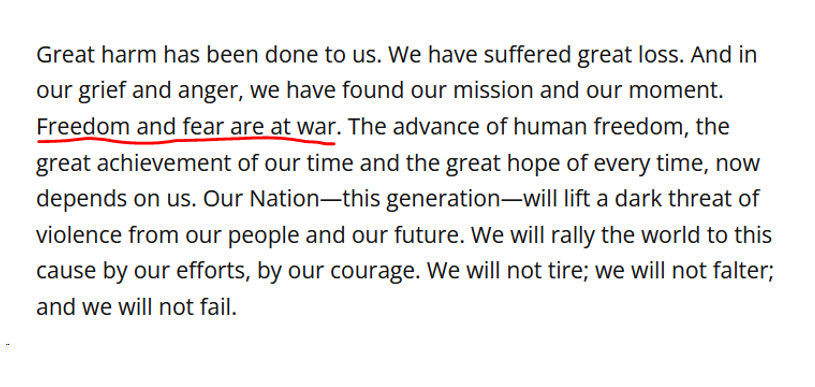 The US was weakened and looked vulnerable. This was captured well by his words to the nation in a September 20, 2001 address to Congress.