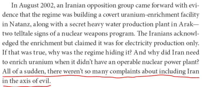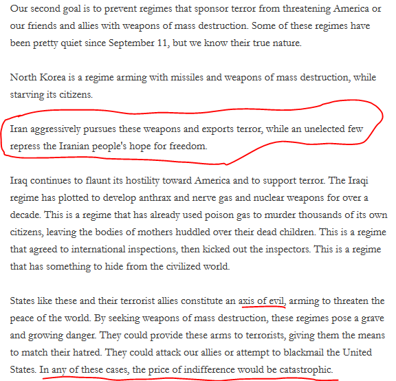 This view was famously captured by the "axis of evil" remarks in Bush's January 2002 State of the Union Address, where he singled out ๐ฎ๐ถ๐ฎ๐ท&๐ฐ๐ต as targets against whom the US would "have the privilege to fight freedom's fight."