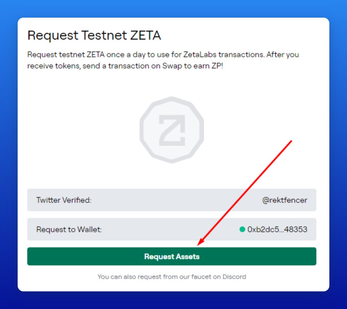 • Write "Zeta faucet drip (your wallet address)"