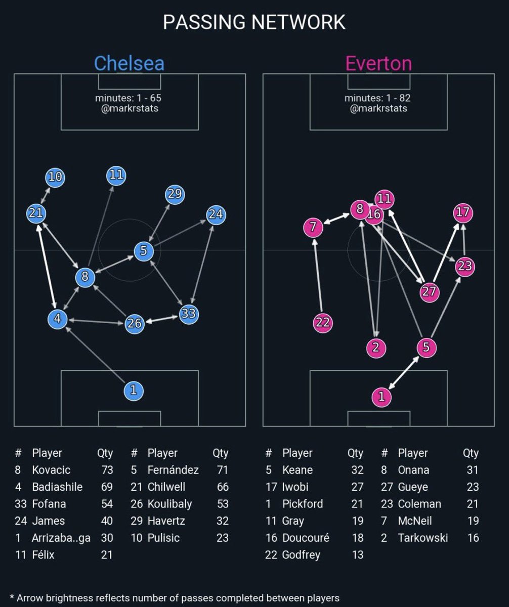Chelsea lined up in a 3-4-3 with Everton on paper lining up in a 4-1-4-1, but in most phases it was more of a 4-4-2 with Chelsea’s shape also changing at times as well (I would like to add Chelsea’s passing map was very good as was the performance for 60 minutes)