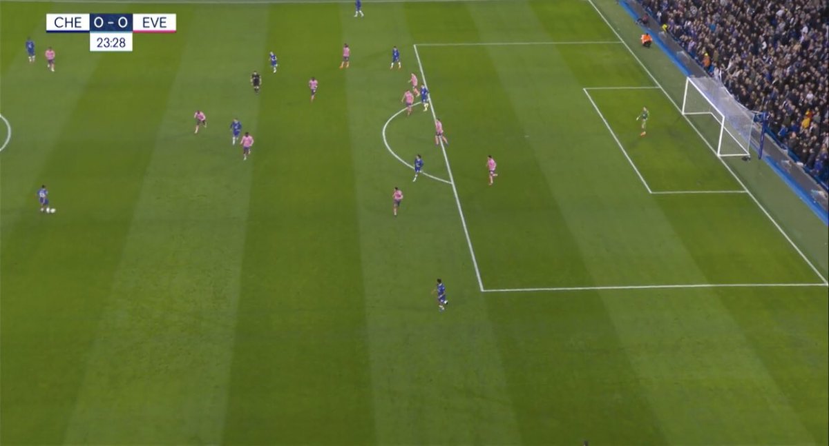 This leads to the first goal, Felix drops behind the Everton double pivot & grabs their attention so Enzo receives with time & space, he play a lovely switch to Chilwell who is free thanks to Pulisic attracting Coleman, Felix arrives from deep to score