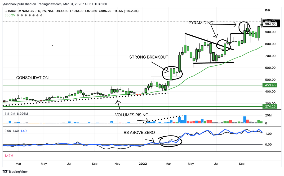 #PYRAMIDING :- AFTER ALL THE ANALYSIS AND ACTION , WITH RS SHOWING THE STRENGTH THE STOCK PERFORMANCE IN FAVOUR , ONE CAN ADD THE STOCK WITH PYRAMIDING CONCEPT AS SHOWIN IN THE CHART BELOW .