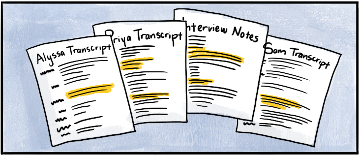 Now, group together all the excerpts associated with a particular code. If youโre using pen and paper, cut out the excerpts and group them together. If youโre using software like @DelveTool, it will automatically collate for you.