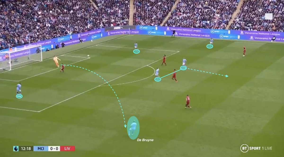 This lateral move is more important than people may think, because Liverpool players have more difficulties to close down this pass option rather than if De Bruyne stayed in his initial position (as interior).