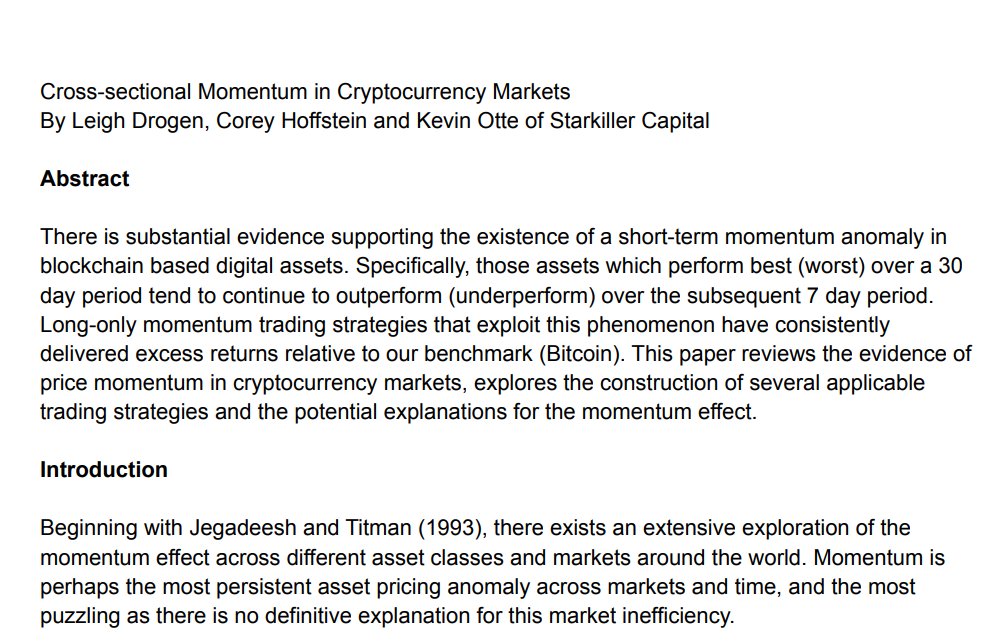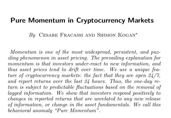 2) "evidence supporting the existence of a short-term momentum anomaly in blockchain based digital assets" Cross-sectional Momentum in Cryptocurrency Markets.