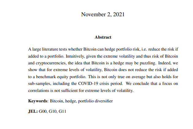 5) "Indeed, we show that for extreme levels of volatility, Bitcoin does not reduce the risk if added to a benchmark equity portfolio. This is not only true on average but also holds for sub-samples" papers.ssrn.com