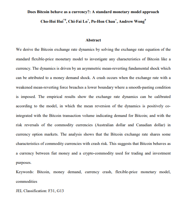 4) "analysis shows that the Bitcoin exchange rate shares some characteristics of commodity currencies with crash risk. This suggests that Bitcoin behaves as a currency between fiat money and a crypto-commodity used for trading and investment purposes." papers.ssrn.com