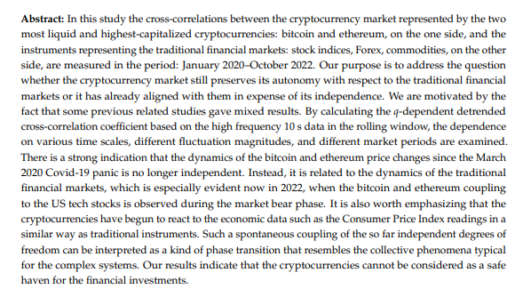 4) "find that crypto-assets have become neither "digital gold" nor a "safe-haven asset" in times of crisis. Their correlations with equities have increased over time, reflecting increasing institutional involvement in cryptos." papers.ssrn.com