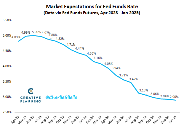 The market is now expecting another 25 bps rate hike in May (to 5.00-5.25%), but then a 180 degree shift to rate cuts starting in July. By the end of 2024, the market is saying that the Fed will cut rates back below 3%.