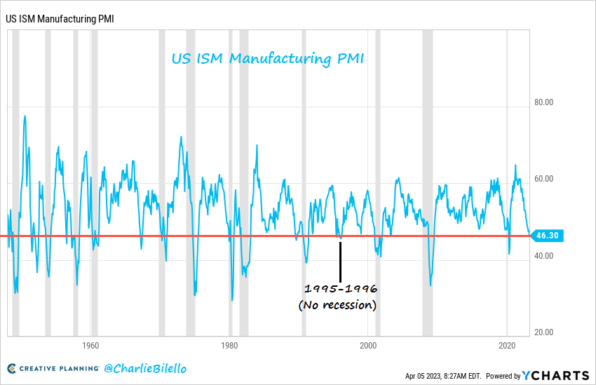 The last 3 times ISM Manufacturing was this low, the US economy was in or about to be in a recession. You have to go back to 1995-96 to find a lower reading with no recession.