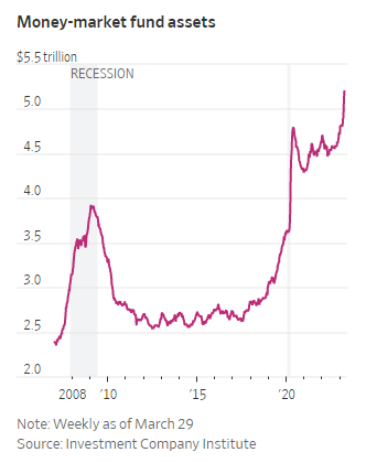 US bank deposits have fallen $363 billion since the beginning of March to $17.3 trillion. Where is much of that money going? Into market-market funds, which have risen $304 billion to a record $5.2 trillion.