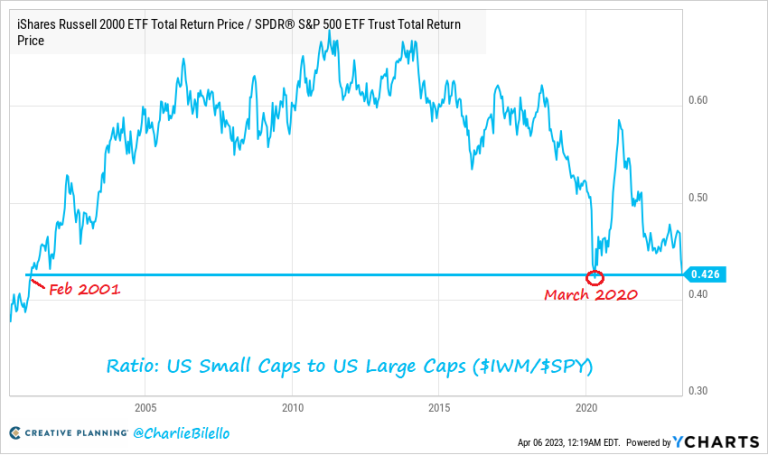 The Ratio of Small Caps to Large Caps is nearing March 2020 levels, which was the lowest we’ve seen since Feb 2001. Over the last 10 years Small Caps have gained 115% (8% annualized) vs. 214% for Large Caps (12% annualized).