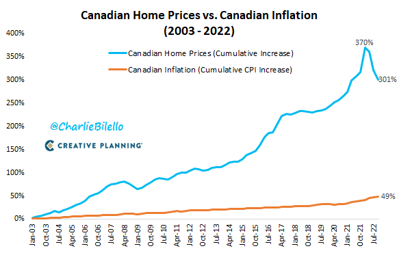 Over the last 20 years, Canadian Home Prices have quadrupled while overall inflation in Canada has increased 49%. This is a bubble of epic proportions.