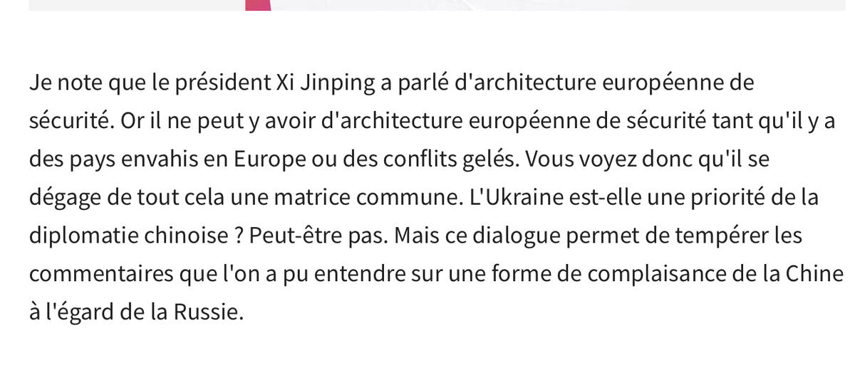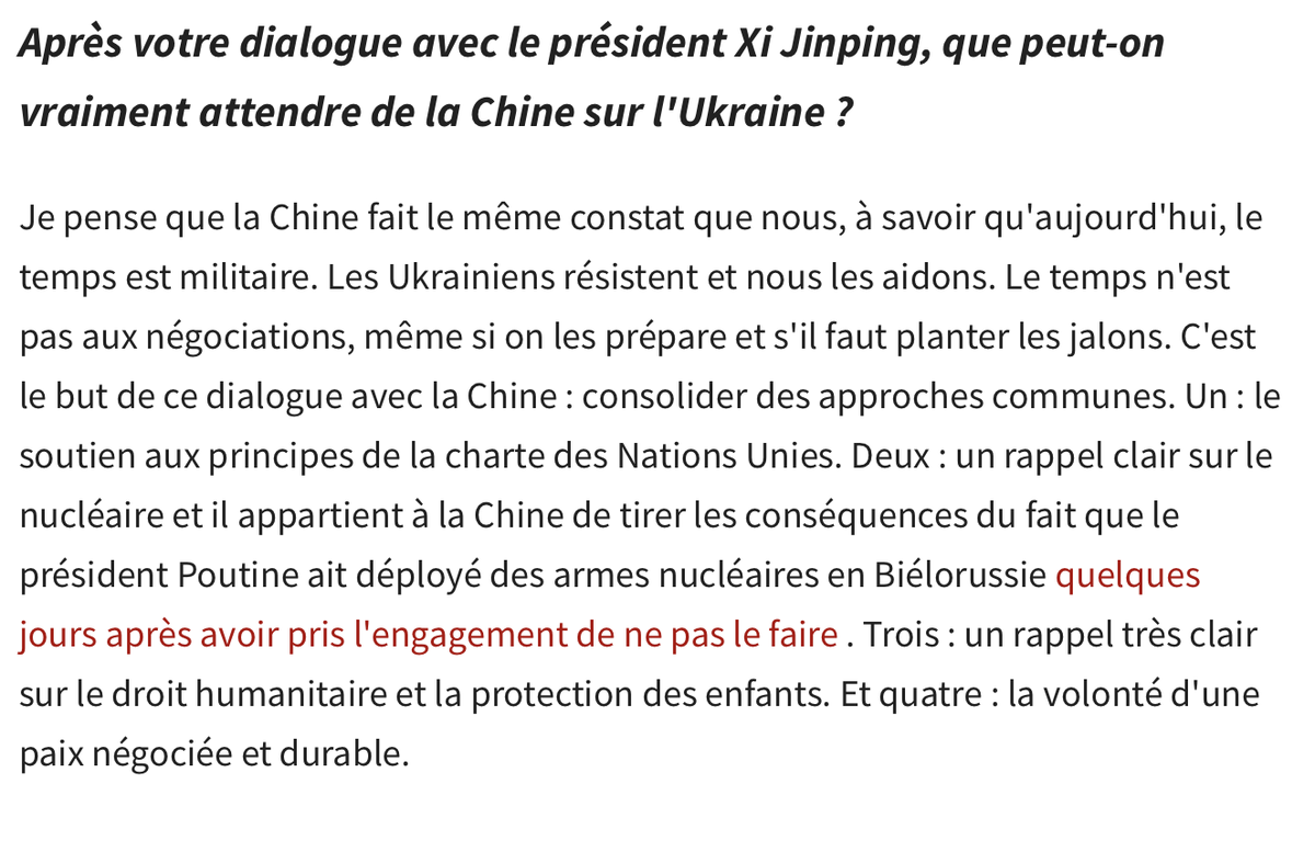 Wait, I thought the line from these media outlets is that Macron is all soft on China, and here Macron is suggesting (albeit subtly) that maybe CHINA needs to take account of *ahem* the responsibility for, uh, Putin going to Belarus with nukes?