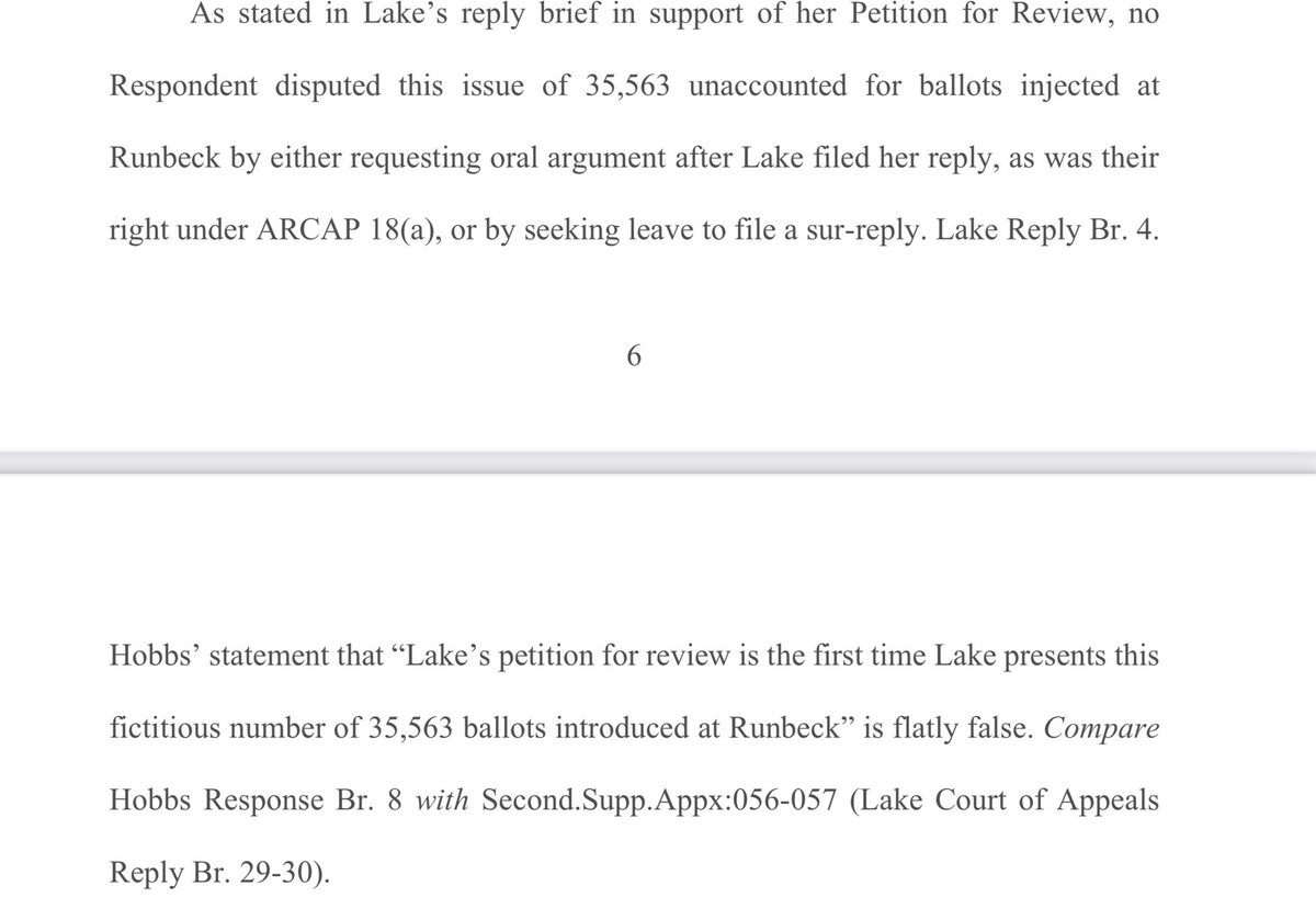 🚨THREAD: @KariLake has filed a brief in the AZ Supreme Court opposing the sanctions proposed against her for raising the argument that 35,563 ballots were unaccounted for and added to the total ballots at Runbeck.